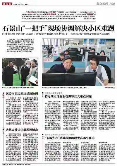 11月21日,石景山区委书记常卫带领石景山区四套班子领导悉数出现在12345市民热线服务中心。在一个多小时的热线接通过程中,石景山区领导共接电116件,同时对于已经处理的诉求进行回访。热线接听结束后,石景山区立即召开现场会,分析评估热线内容,当场解决,并选取较有代表性的问题,在当天下午现场查看。304am永利集团经理刘泽军教授在现场发表了专家点评